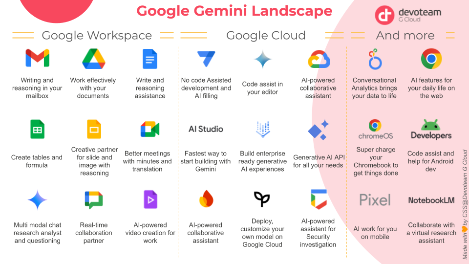 Source : Google Cloud, Devoteam (infographies écosystème Gemini).